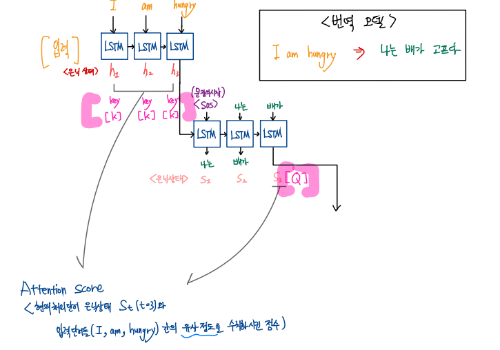 K : 인코더 셀의 모든 은닉상태들의 라벨, key의 개수 : 단어의 개수