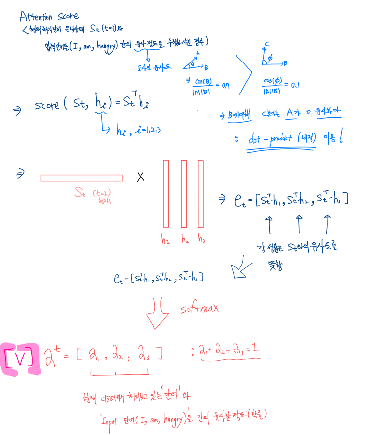 3. 디코더에서 처리하고 있는 단어와 유사한 단어를 인코더에 입력된 단어로부터 찾기 위해 코사인 유사도를 활용함.