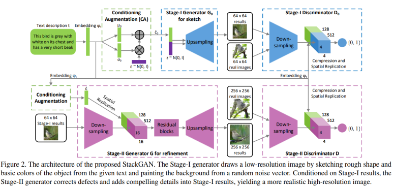 StackGAN 이라는 이름을 보건데, GAN을 stack(쌓다)하였음을 유추할 수 있다. StackGAN은 text condition을 줌으로써 이미지 생성을 했을 때, 성능이 그리 좋지 못한것을 보고 더 명확하고, 고화질의 이미지를 생성하기 위해 다음과 같은 아이디어를 제시했다. 2개의 GAN을 사용하는 것이다. 첫번째 GAN은 대략적인 형태, 사물과 배경의 색깔등에 중점을 둔 스케치 이미지 생성을 담당한다. 두번째 GAN은 앞서 생성한 스케치 이미지의 오류를 고치면서 디테일을 추가하고, 더 고화질의 이미지를 최종적으로 생성한다. 이렇게 세부 역할 분담을 하면, 어려운 문제가 그나마 쉬운 여러 문제로 나뉘게 되고 덕분에 더 좋은 성능의 이미지를 얻을 수 있다. 목차 1. 전반적인 도식도..